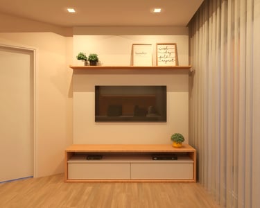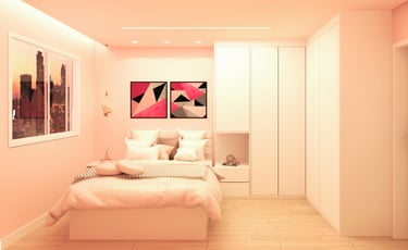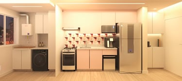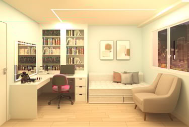 Gosta bastante da cor rosa, e quando está trabalhando, fica horas fazendo plantão então gosta de chegar em casa e ter um local de conforto e aconchego. Mesmo morando sozinha, precisa de bastante espaço de armazenamento, pois também é revendedora de alguns produtos, então acaba fazendo estoque de alguns itens, além de ter muito livro, sendo necessário também ter um local agradável para sentar e fazer suas leituras. Outra solicitação é ter uma bancada multifuncional, combinando local de estudo e penteadeira.