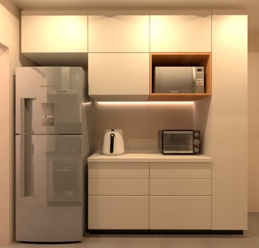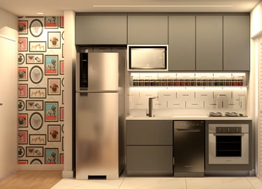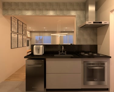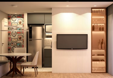 Um dos desafios também foi ter bastante espaço de armazenamento na cozinha, mantendo uma lava-louça, a solução foi retirar a parede entre sala e cozinha, não ter rack convencional na sala, ter apenas o painel da TV, os aparelhos da mesma ficam na cristaleira, e no lugar do rack, fazer um armário voltado para a cozinha, conforme imagens ao lado.