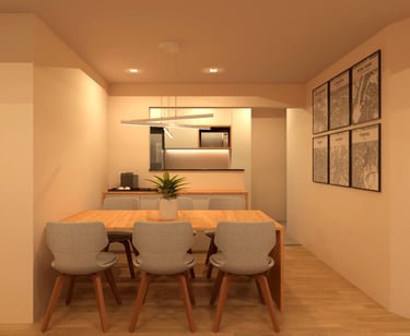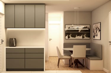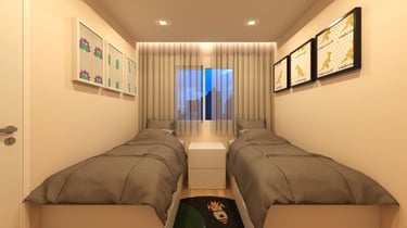 Gostam de cores mais neutras. Após a pandemia, precisaram adaptar um espaço da sala para o escritório, e seria interessante ter espaço para um computador e para máquina de costura ou artesanatos, como gostam de passar bastante tempo com as crianças, quiseram um espaço aberto mesmo para essa função. Para a sala de jantar, antes tinham uma mesa que achavam muito grande, então conseguimos diminuir o tamanho da mesa e ainda colocar um buffet de apoio, também para mais armazenamento. Para o quarto dos meninos, a ideia era manter o guarda-roupa existente, sem fazer beliche, mantendo espaço pra brincar.