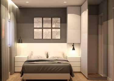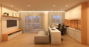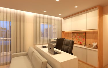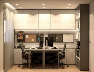 Gostam de cores mais sóbrias, como ambos trabalham em casa, necessitam de um home office aconchegante e eficiente. Outro ponto importante é a necessidade de bastante espaço para armazenamento, pois ele tem bastante eletrônicos e livros, ela tem bastante material e portfólio da profissão, além da necessidade de um armário extra, pois o guarda-roupas da suíte é pequeno pros dois.