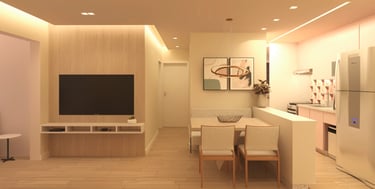 Apartamento de 80m² para um casal, por volta de seus 40 anos, e dois filhos, com 8 e 10 anos de idade. Ele é engenheiro e ela faz artesanatos.